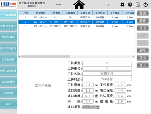 李榮團(tuán)隊(duì)開發(fā)了一套激光焊接裝備數(shù)字化控制系統(tǒng)人機(jī)界面軟件,對于提升設(shè)備整體的穩(wěn)定性和信息化程度意義重大。該軟件基于QT平臺(tái)使用C++語言編寫,在工控機(jī)運(yùn)行顯示,通過外接鍵盤來輸入?yún)?shù),手動(dòng)或者自動(dòng)執(zhí)行焊接操作。具備生產(chǎn)信息、生產(chǎn)數(shù)據(jù)監(jiān)控、參數(shù)設(shè)置、歷史數(shù)據(jù)追溯及數(shù)據(jù)處理、報(bào)警及維護(hù)、監(jiān)控顯示、信息化看板等主要功能模塊?;贛YSQL建立工藝數(shù)據(jù)庫,工藝數(shù)據(jù)與工件信息和操作人員相匹配,實(shí)現(xiàn)信息的存儲(chǔ)、分類整理和統(tǒng)計(jì)分析,并能夠?qū)崿F(xiàn)與上層企業(yè)信息管理系統(tǒng)的互聯(lián)互通,企業(yè)可隨時(shí)導(dǎo)出需要的生產(chǎn)數(shù)據(jù),方便企業(yè)進(jìn)行生產(chǎn)規(guī)劃、生產(chǎn)進(jìn)度管理和產(chǎn)品質(zhì)量追溯,推動(dòng)企業(yè)向數(shù)字化工廠發(fā)展。