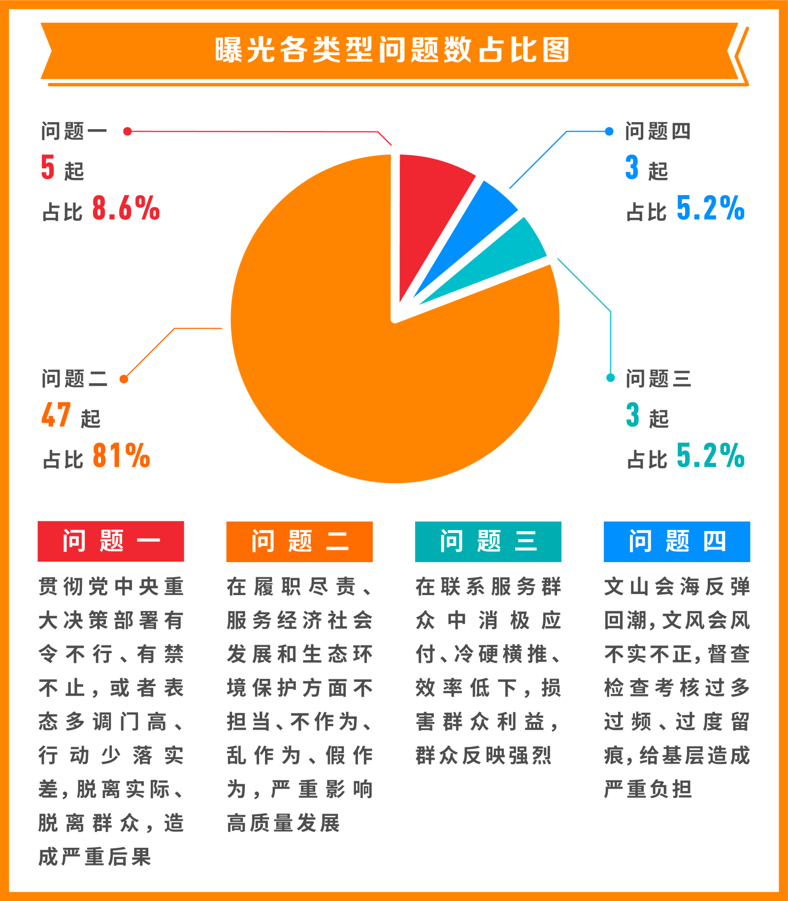 從具體問題類型看,“貫徹黨中央重大決策部署有令不行、有禁不止,或者表態(tài)多調(diào)門高、行動少落實差,脫離實際、脫離群眾,造成嚴重后果”方面問題5起,占比8.6%;“在履職盡責、服務(wù)經(jīng)濟社會發(fā)展和生態(tài)環(huán)境保護方面不擔當、不作為、亂作為、假作為,嚴重影響高質(zhì)量發(fā)展”方面問題47起,占比81%;“在聯(lián)系服務(wù)群眾中消極應(yīng)付、冷硬橫推、效率低下,損害群眾利益,群眾反映強烈”方面問題3起,占比5.2%;“文山會海反彈回潮,文風(fēng)會風(fēng)不實不正,督查檢查考核過多過頻、過度留痕,給基層造成嚴重負擔”方面問題3起,占比5.2%。