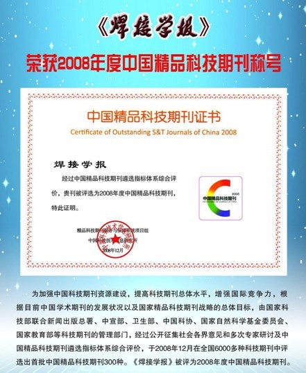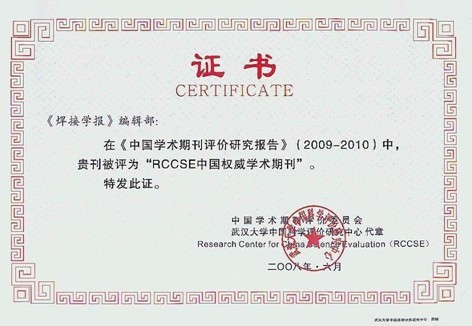 在《中國(guó)學(xué)術(shù)期刊評(píng)價(jià)研究報(bào)告(2009-2010)》中,《焊接學(xué)報(bào)》被中國(guó)學(xué)術(shù)期刊評(píng)價(jià)委員會(huì)評(píng)為RCCSE中國(guó)權(quán)威學(xué)術(shù)期刊。