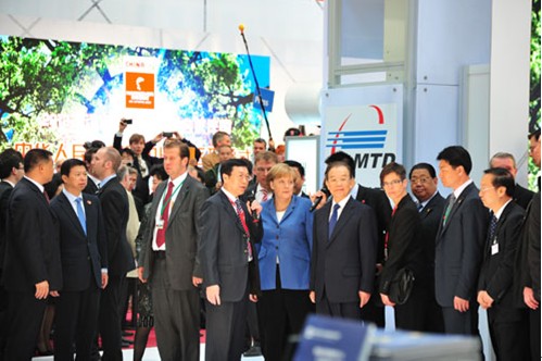 李新亞院長就參展AGV小車的技術(shù)特點(diǎn)、應(yīng)用領(lǐng)域、運(yùn)行方式等情況向溫家寶總理和默克爾總理做了詳細(xì)匯報,溫家寶總理和默克爾總理對AGV產(chǎn)品高度關(guān)注,與李新亞院長親切握手。
