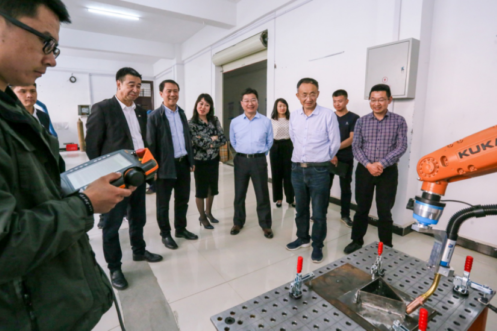在哈焊院的大力支持下,2017年涉外學(xué)院建成了焊接機(jī)器人實(shí)訓(xùn)室。后經(jīng)哈焊院“穿針引線”,2019年中國(guó)焊接協(xié)會(huì)機(jī)器人焊接(信陽(yáng))培訓(xùn)基地(以下簡(jiǎn)稱“培訓(xùn)基地”)也在學(xué)院落戶。為助力培訓(xùn)基地建設(shè),哈焊院向其捐贈(zèng)了洛氏硬度計(jì)、金相顯微鏡和萬(wàn)能液壓試驗(yàn)機(jī)等三臺(tái)檢測(cè)儀器設(shè)備,并克服現(xiàn)場(chǎng)缺少大型吊裝設(shè)備的困難,想方設(shè)法通過(guò)現(xiàn)場(chǎng)組制龍門架的辦法將設(shè)備成功扶立、順利完成了數(shù)噸重的萬(wàn)能液壓試驗(yàn)機(jī)的安裝調(diào)試及培訓(xùn)。三臺(tái)檢測(cè)儀器的投入使用,拓展了技術(shù)學(xué)院在金屬材料力學(xué)和金相領(lǐng)域的學(xué)科建設(shè),更為全國(guó)焊接機(jī)器人培訓(xùn)基地的建成奠定了堅(jiān)實(shí)基礎(chǔ)。