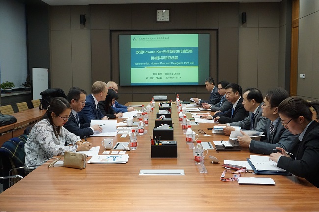 李建友副總經(jīng)理對霍華德•科爾先生一行的到來表示熱烈歡迎,并重點(diǎn)圍繞集團(tuán)在基礎(chǔ)共性技術(shù)研究、標(biāo)準(zhǔn)化、檢驗檢測、認(rèn)證認(rèn)可、行業(yè)服務(wù)等方面業(yè)務(wù),以及在支撐中國裝備制造業(yè)高質(zhì)量發(fā)展中發(fā)揮的重要作用進(jìn)行了系統(tǒng)介紹?;羧A德•科爾對機(jī)械總院集團(tuán)的熱情接待表示感謝。他表示,自今年9月李建友副總經(jīng)理率團(tuán)訪問BSI以來,機(jī)械總院集團(tuán)與BSI的合作被提到新的高度,希望雙方重點(diǎn)圍繞設(shè)施管理、增材制造等方面形成全方位的務(wù)實合作,實現(xiàn)在標(biāo)準(zhǔn)、檢測、認(rèn)證等方面的共贏發(fā)展。雙方還就2020年共同舉辦中英標(biāo)準(zhǔn)化高峰論壇等事宜進(jìn)行了深入探討。